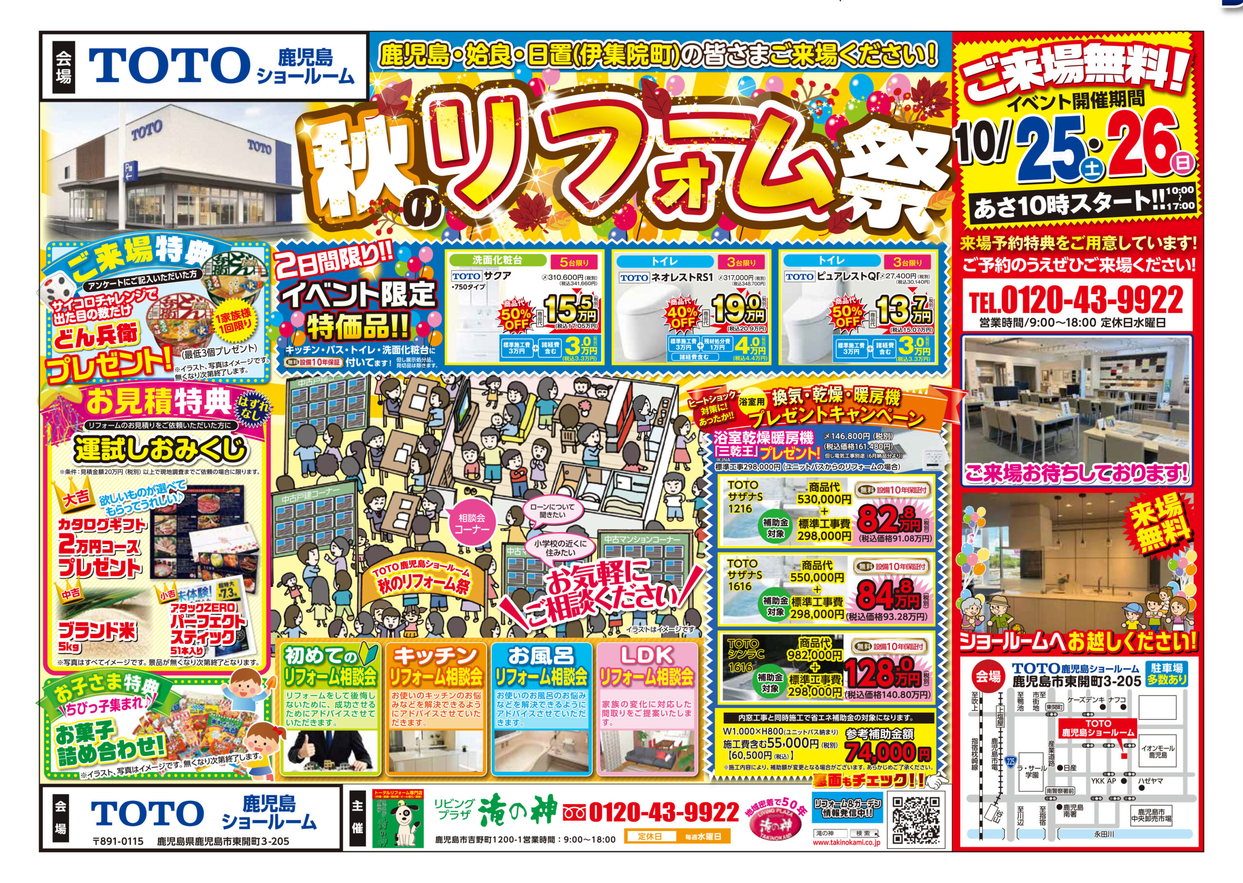 TOTOショールーム鹿児島】秋のTOTOリフォーム祭開催!ご来場特典盛りだくさん☆イベント限定特価品あります(2日間限り!)来場無料☆イベント開催期間:10/25(土)~10/26(日)あさ10時スタート(17時まで)【鹿児島市・姶良市・伊集院地区のリフォーム・リノベーション・塗装・外構・造園】